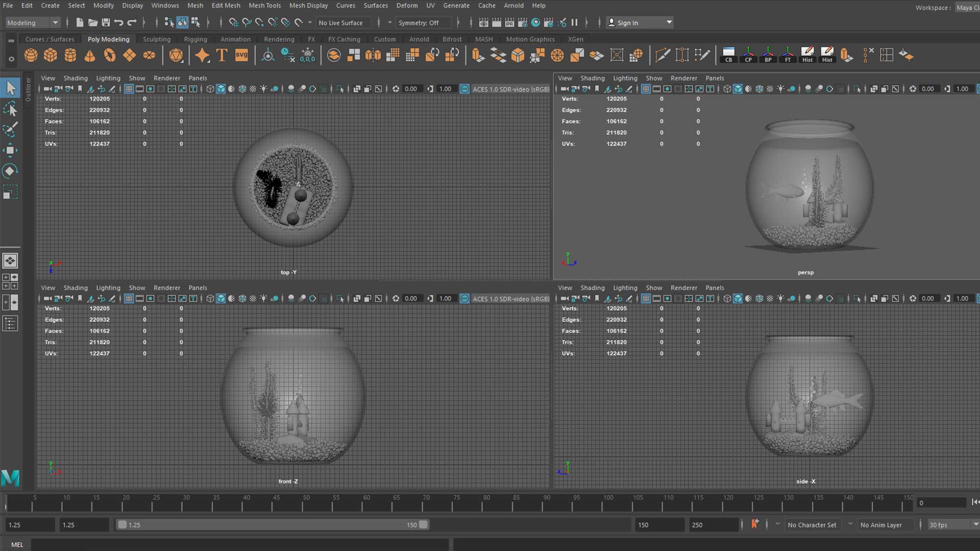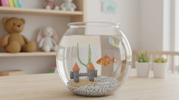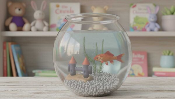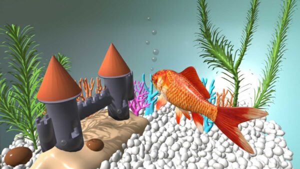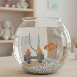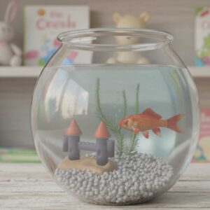 This 3D model of a fish bowl features a classic round, transparent glass design with smooth, curved surfaces that realistically mimic the refraction and reflection of light through water. Inside the bowl, the model includes detailed aquatic elements such as a sandy gravel base, artificial plants, and a small castle ornament, creating a vibrant underwater scene. The water level is slightly below the rim to avoid spillage, and the glass material is rendered with subtle imperfections for added realism. Ideal for animation, games, or interior visualization.