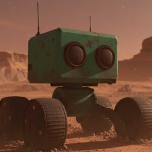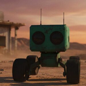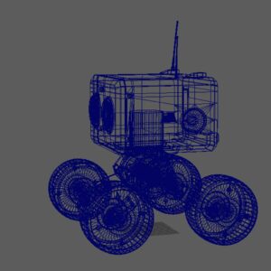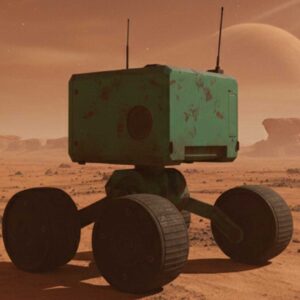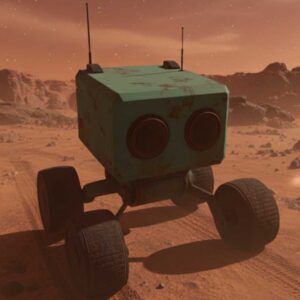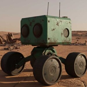 Stylized wheeled robot 3D model featuring a compact industrial design with a weathered teal metal body, twin front-facing sensor lenses, and dual antennae for added character, built on a rugged four-wheel suspension system for dynamic sci-fi or post-apocalyptic scenes; ideal for use in video games, cinematics, VR/AR, and concept visualizations, with detailed worn metal textures that add realism and storytelling value, clean topology suitable for animation, and optimized geometry for real-time rendering across modern game engines.